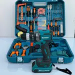 اقلام داخل کیف شامل آچار فرانسه، دم باریک و انبردست، تیز بر با تیغ اضافه، پیچ و روپلاک، مته در سایزهای مختلف، چکش و اره برش، دو باطری منبع تغذیه دریل شارژی، شارژر باتری با ولتاژ 36 ولت ورودی، مجموعه بکس و پیچ گوشتی، فازمتر و لنت برق، انواع پیچ\گوشتی کوچک با سریهای قابل تعویض، و متر ساده است که تمام نیازهای شما را در هر پروژهای برآورده میکند. در نهایت اگر بخواهیم کاربرد های این پک ماکل ۳۶ ولت ماکیتا را اسم ببریم باید بگوییم برای تمامی فعالیت های صنعتی مانند تعمیرات یا تزئینات خودرو، سیم کشی، کناف کاری و دکور داخلی، ساخت و ساز، نجاری و ام دی اف کاری و نیازهای خانگی و … مناسب می باشد.